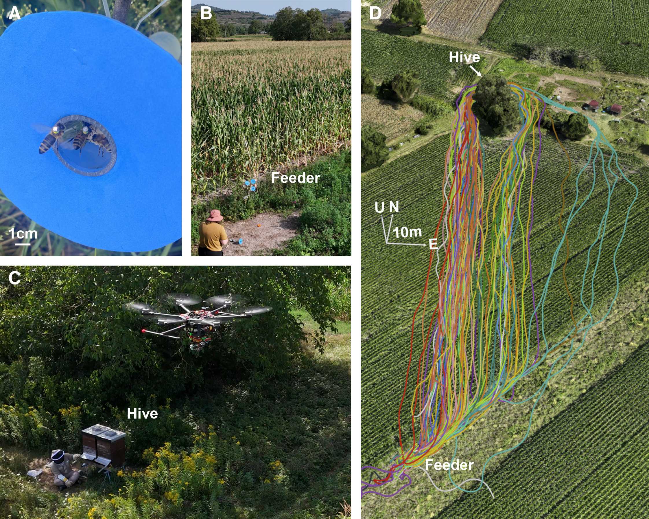 Авторы исследования, опубликованного в журнале Current Biology, применили мультикоптер с системой быстрого захвата цели. На спинки 26 рабочих пчел наклеили световозвращающие маркеры весом 20 миллиграммов. Две инфракрасные камеры дрона фиксировали отраженный свет, а компьютерная система управления автоматически направляла дрон вслед за насекомым. Коптер преследовал каждую особь на пути от улья до кормушки с сахарным сиропом, расположенной в 122 метрах.