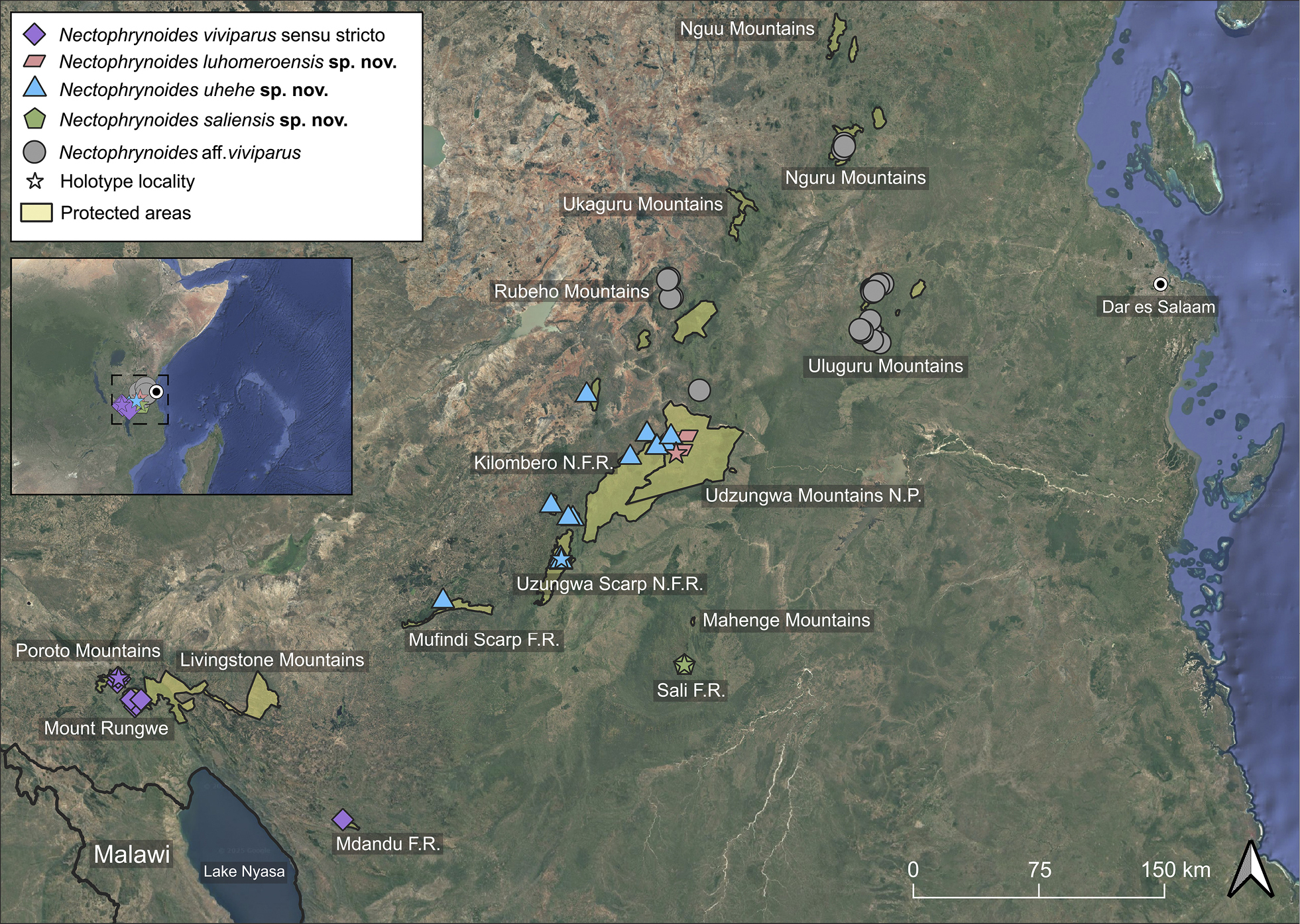 Кроме того, Лоадер и его соавторы выявили в составе Nectophrynoides viviparus (в широком смысле) еще три эволюционные линии. Две из них включают особей с хребта Удзунгва, а третья — с хребта Махенге (оба этих хребта относятся к Восточному рифту). Каждую из этих линий исследователи выделили в новый вид. Два вида жаб с хребта Удзунгва получили названия Nectophrynoides luhomeroensis и Nectophrynoides uhehe, а вид с хребта Махенге — Nectophrynoides saliensis. Ближайшим родственником Nectophrynoides luhomeroensis и Nectophrynoides uhehe оказался вид Nectophrynoides laticeps с хребта Укагуру, в то время как Nectophrynoides saliensis находится в сестринских отношениях с Nectophrynoides viviparus (в узком смысле).