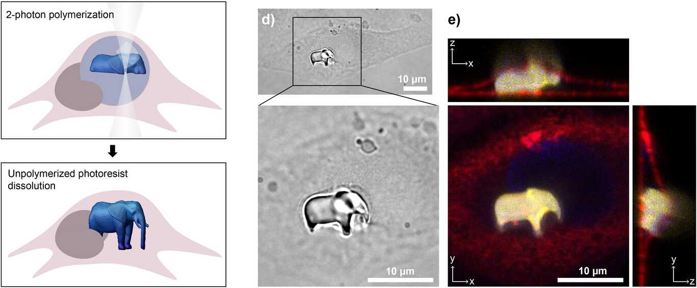 После завершения печати остатки фоторезиста растворялись, и внутри клетки оставался только созданный объект. Таким образом команда ученых смогла напечатать трехмерную фигурку слона высотой 10 микрометров и узоры, внешне напоминающие штрихкод. Выжили после манипуляции около 50% клеток, причем некоторые из них продолжили делиться и передали напечатанный объект одной из дочерних клеток.