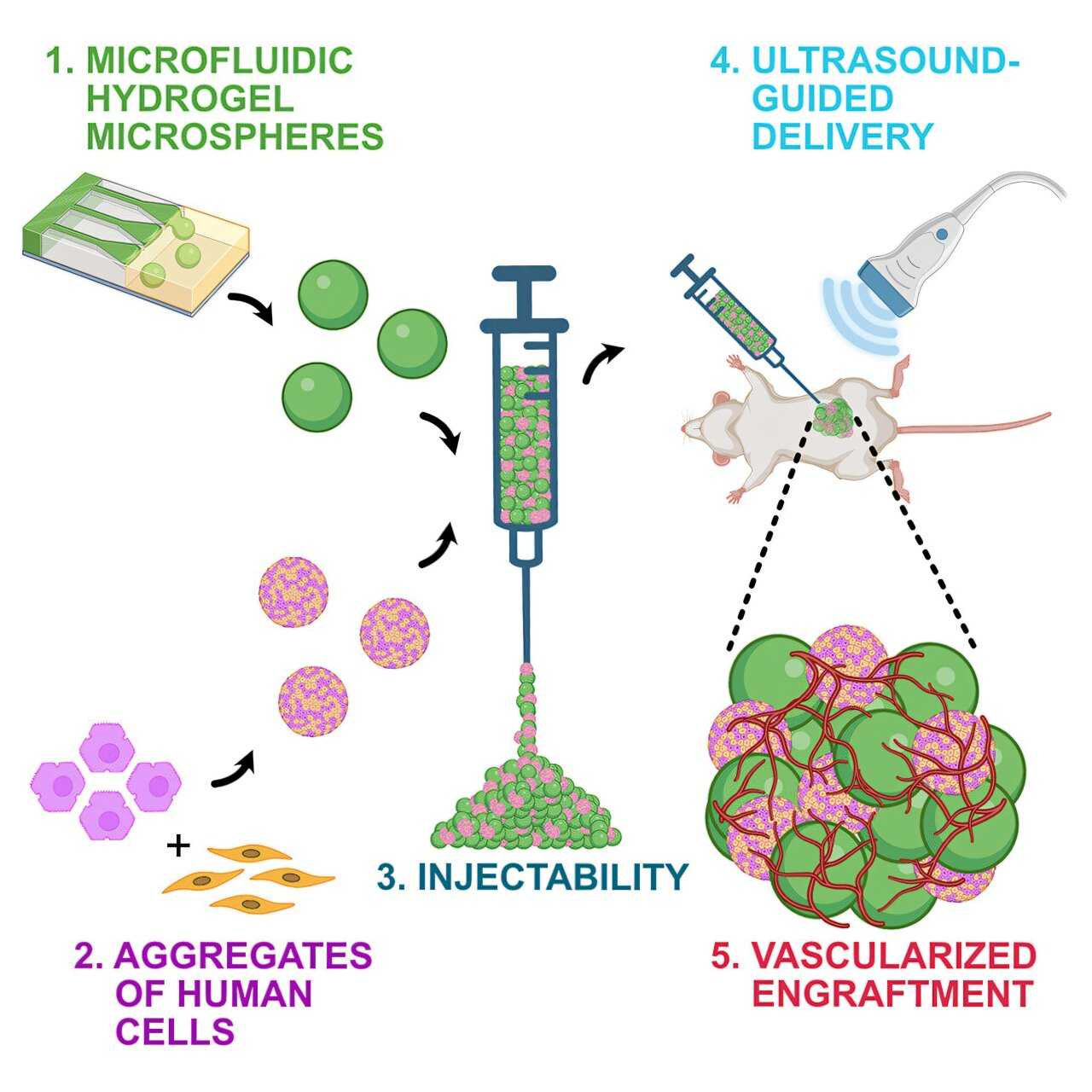 Авторы новой статьи научились вводить гепатоциты с помощью шприца одновременно с гидрогелевыми микросферами, которые во время инъекции ведут себя подобно жидкости, а при попадании в организм становятся твердыми. Эти микросферы помогают гепатоцитам оставаться вместе и взаимодействовать с близлежащими кровеносными сосудами. Выживают пересаженные клетки при поддержке фибробластов, которые также содержатся в препарате для инъекции.
