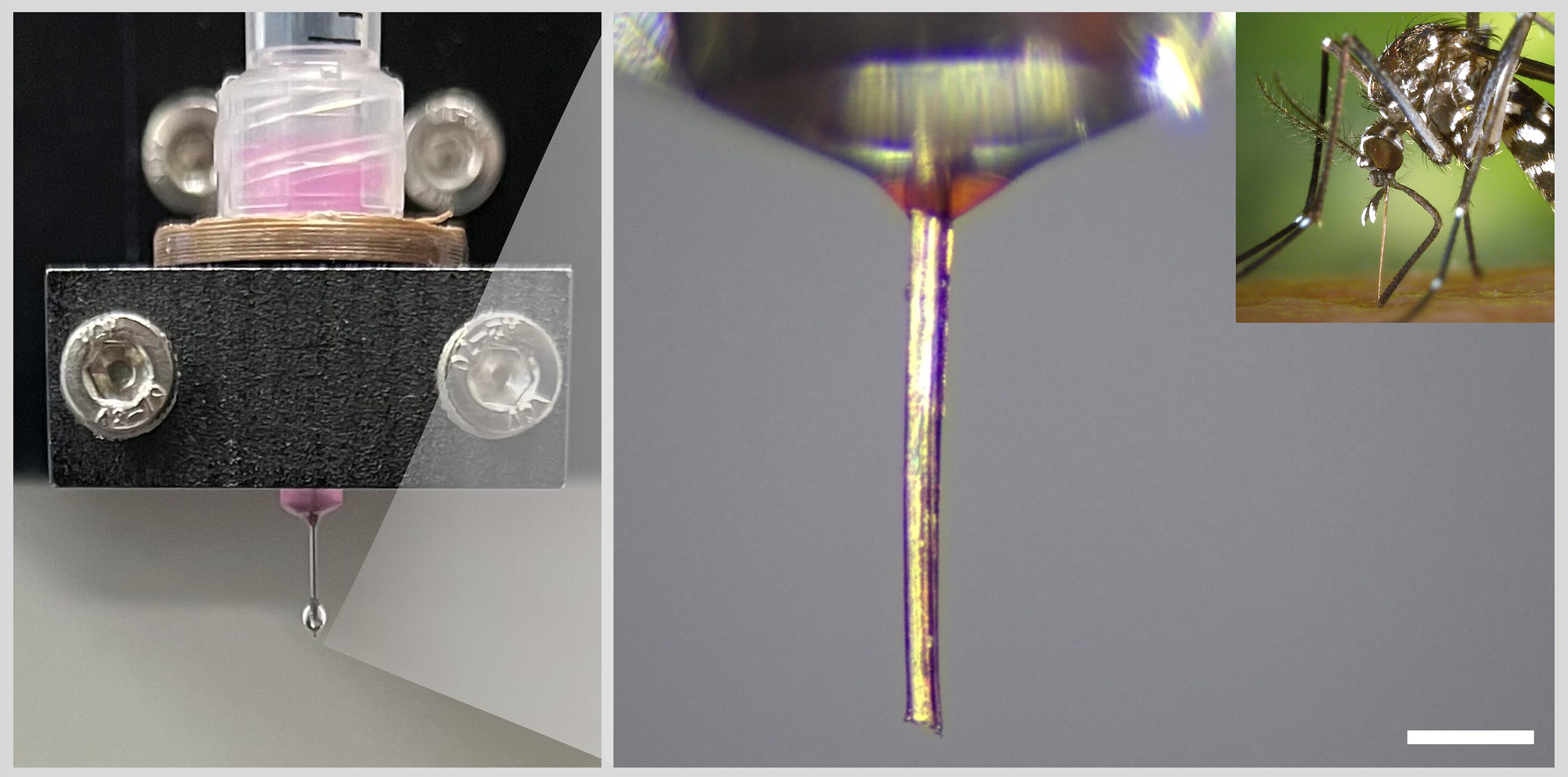 Комариный хоботок — прочный инструмент для перекачки жидкостей, внутренний диаметр его канала составляет всего 20 микрометров. Это почти в два раза меньше самых тонких коммерческих аналогов и вдвое тоньше человеческого волоса. Природная игла при этом оказалась достаточно жесткой, чтобы сохранять прямую форму при печати и не деформироваться при контакте с подложкой.