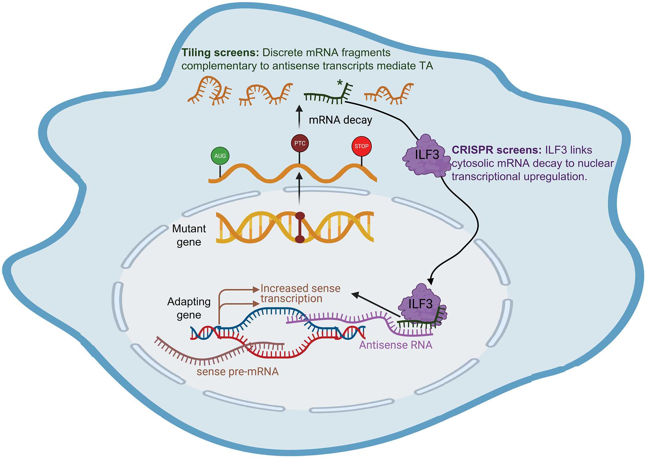 Анализ помог выявить белок ILF3 как главное звено процесса. Он захватывает фрагменты уничтоженной мутантной РНК в цитоплазме и переносит их в клеточное ядро. Там этот комплекс находит комплементарную фрагменту РНК антисмысловую цепочку на ДНК здорового гена-паралога.