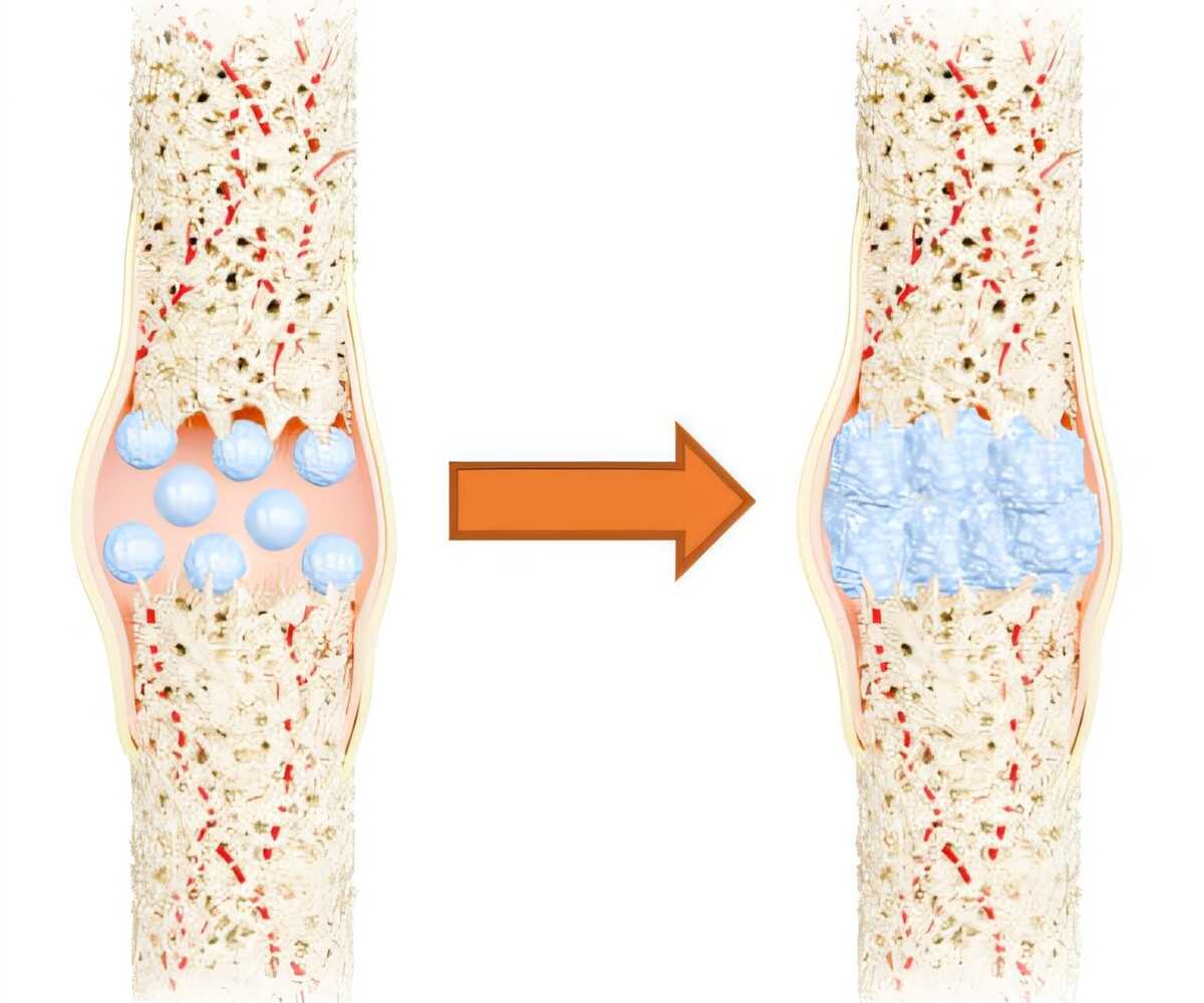 Новый материал увеличивается в объеме после поглощения воды и сохраняет максимальную прочность на сжатие. Он формирует пористую структуру, которая способствует адгезии клеток организма к «костной заплатке». Его механические свойства ближе к свойствам натуральной кости, что повышает комфорт и подвижность пациента. До наступления отвердевания материалу можно придать любую форму, поэтому он упростит восстановление костных дефектов сложной или неправильной формы.