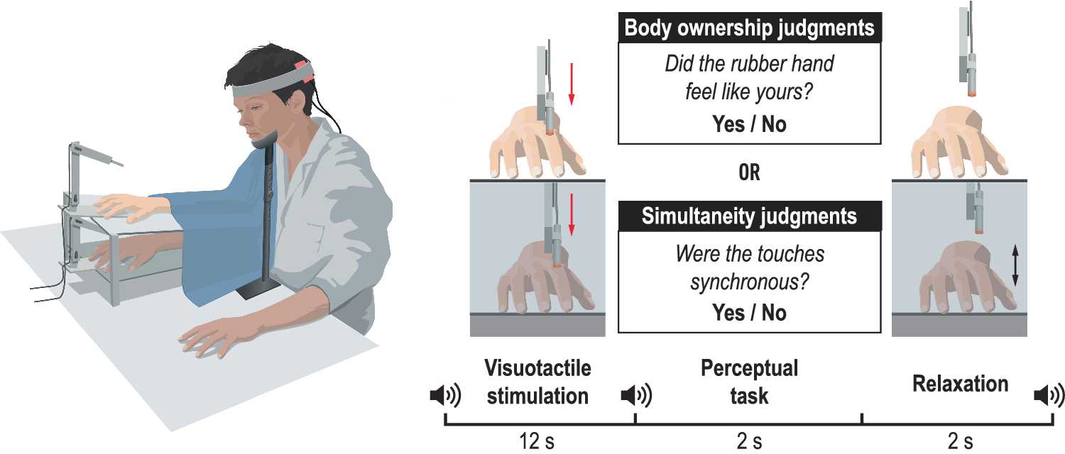 Авторы исследования, опубликованного в журнале Nature Communications, использовали классическую «иллюзию резиновой руки», автоматизировав ее для точности. Роботизированные манипуляторы наносили ритмичные удары по скрытой настоящей руке участника и по лежащему на виду резиновому протезу. Ученые меняли задержку между ударами с точностью до миллисекунд, фиксируя момент, когда человек переставал считать резиновую руку своей.