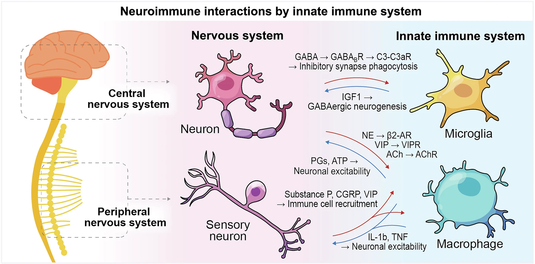 Ранние исследования фокусировались преимущественно на взаимодействиях Т-клеток и нейронов в контексте адаптивного иммунитета. Однако появляющиеся данные демонстрируют, что клетки врожденного иммунитета напрямую «общаются» с нейронами.