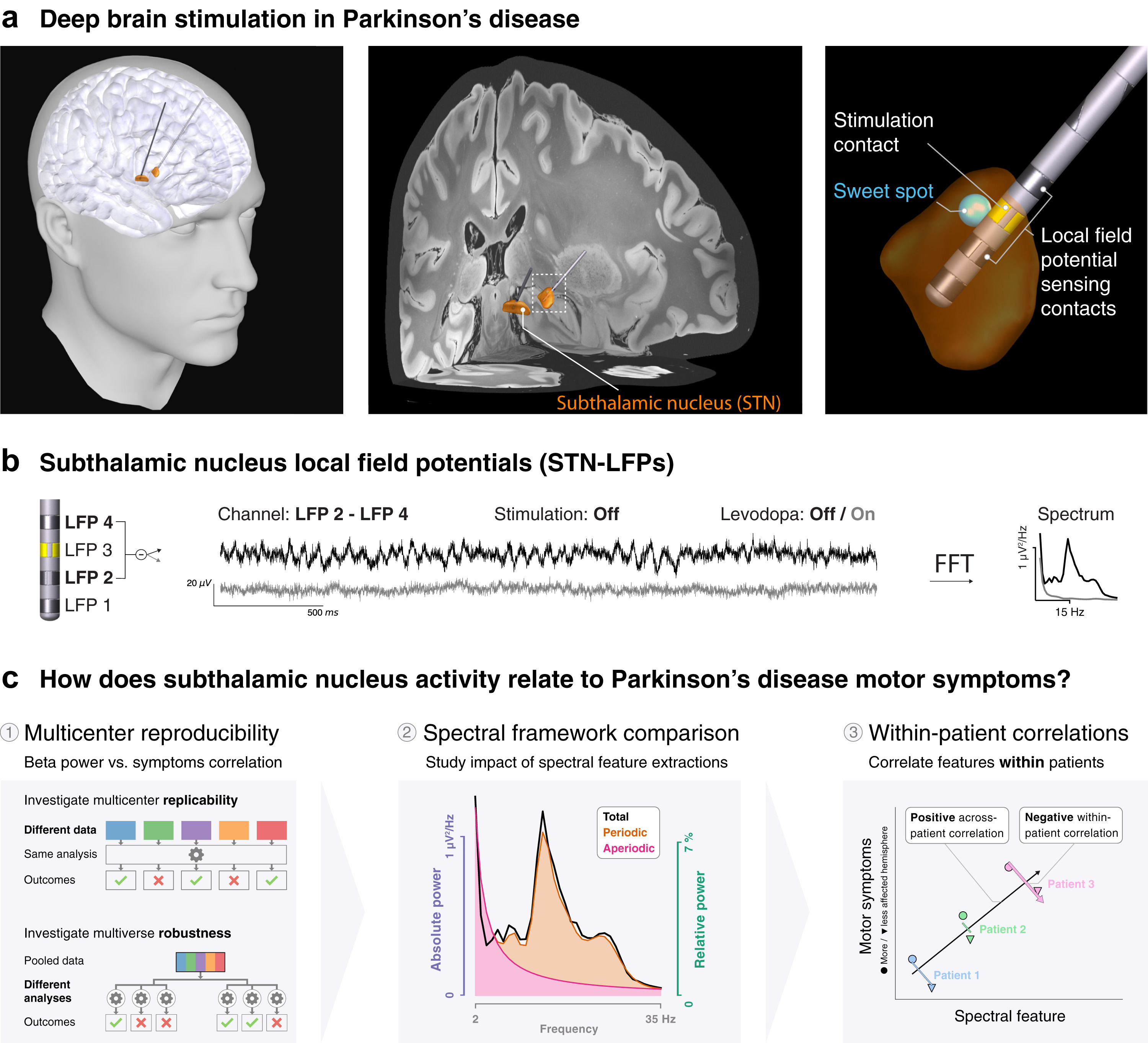 Глубокая стимуляция мозга (DBS) – это эффективный метод лечения болезни Паркинсона, который позволяет не только подавать ток в мозг, но и считывать, анализируя, его ритмы. Долгое время считалось, что болезнь Паркинсона связана с усилением бета-ритмов (13-30 Гц) в субталамическом ядре (чем сильнее бета-ритм, тем выраженнее проблемы с движениями у пациента). Однако результаты различных исследований часто оказывались противоречивыми, а вклад ритмов других частот оставался недостаточно изученным.
