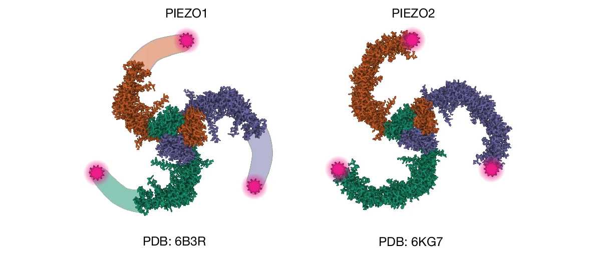 Известно, что семейство механочувствительных каналов PIEZO включает две изоформы: PIEZO1 реагирует на растяжение мембраны и играет ключевую роль в работе внутренних органов, PIEZO2 отвечает за осязание, ощущение положения тела и, даже, регуляцию дыхания. Белок PIEZO2 формирует механочувствительный ионный канал, который открывается в ответ на механическое воздействие (давление, растяжение, вибрацию) и запускает сигнал, который мозг воспринимает как ощущение.