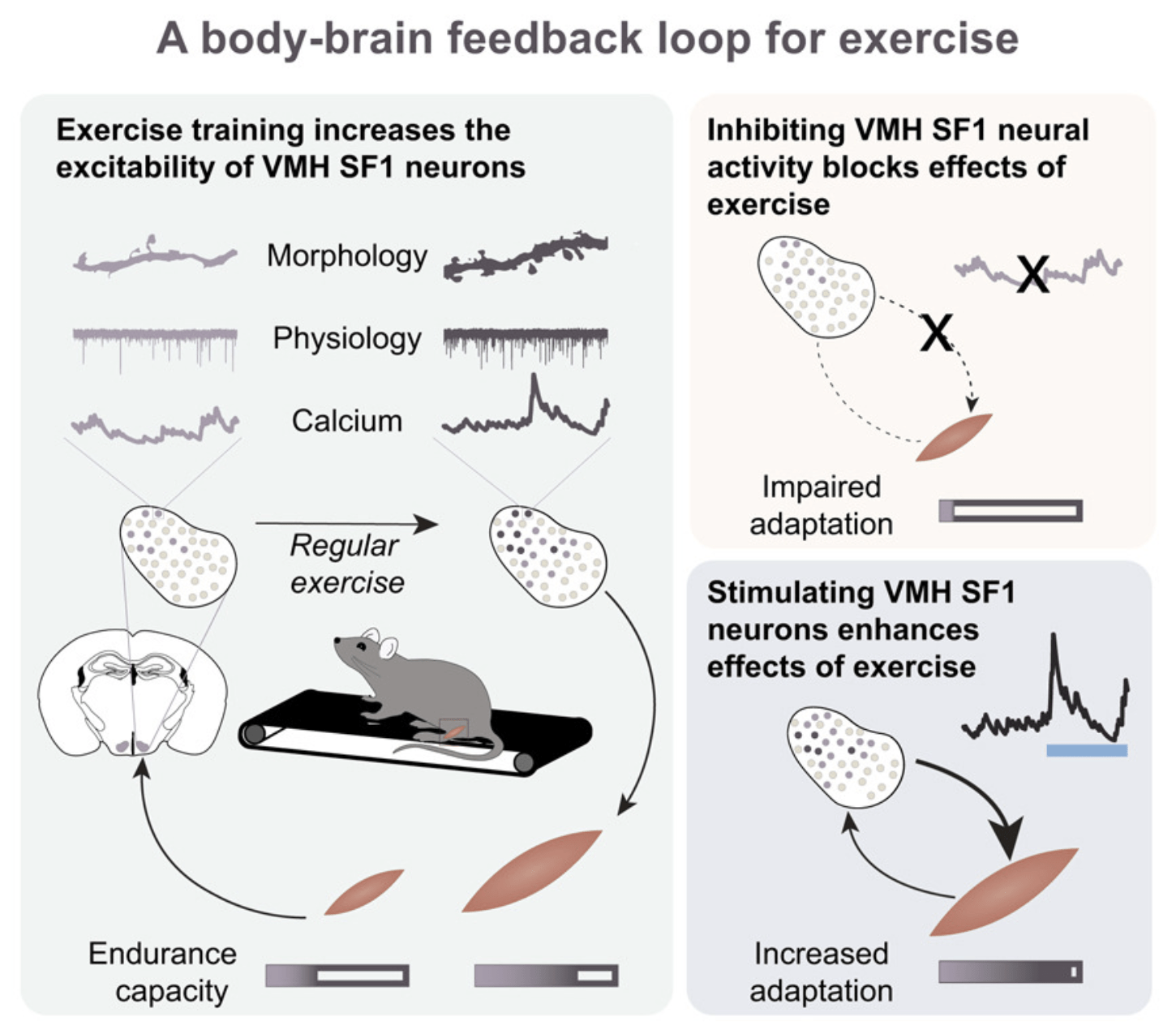 До сих пор периферическое звено в адаптации к нагрузкам считалось ключевым: регулярные тренировки улучшают выносливость за счет перестройки скелетной мускулатуры, сердечно-сосудистой, эндокринной и иммунной систем. Нейронные изменения в мозге – нейрогенез, усиление синаптической связности, снижение нейровоспаления – рассматривались как следствие, а не причина роста выносливости. Вентромедиальный гипоталамус давно известен как структура, регулирующая энергетический гомеостаз: SF1-нейроны объединяют периферические метаболические сигналы (лептин, инсулин, глюкозу) и управляют расходом энергии. Генетические эксперименты указывали, что снижение экспрессии SF1 нарушает прирост выносливости, но механизм оставался неизвестным.