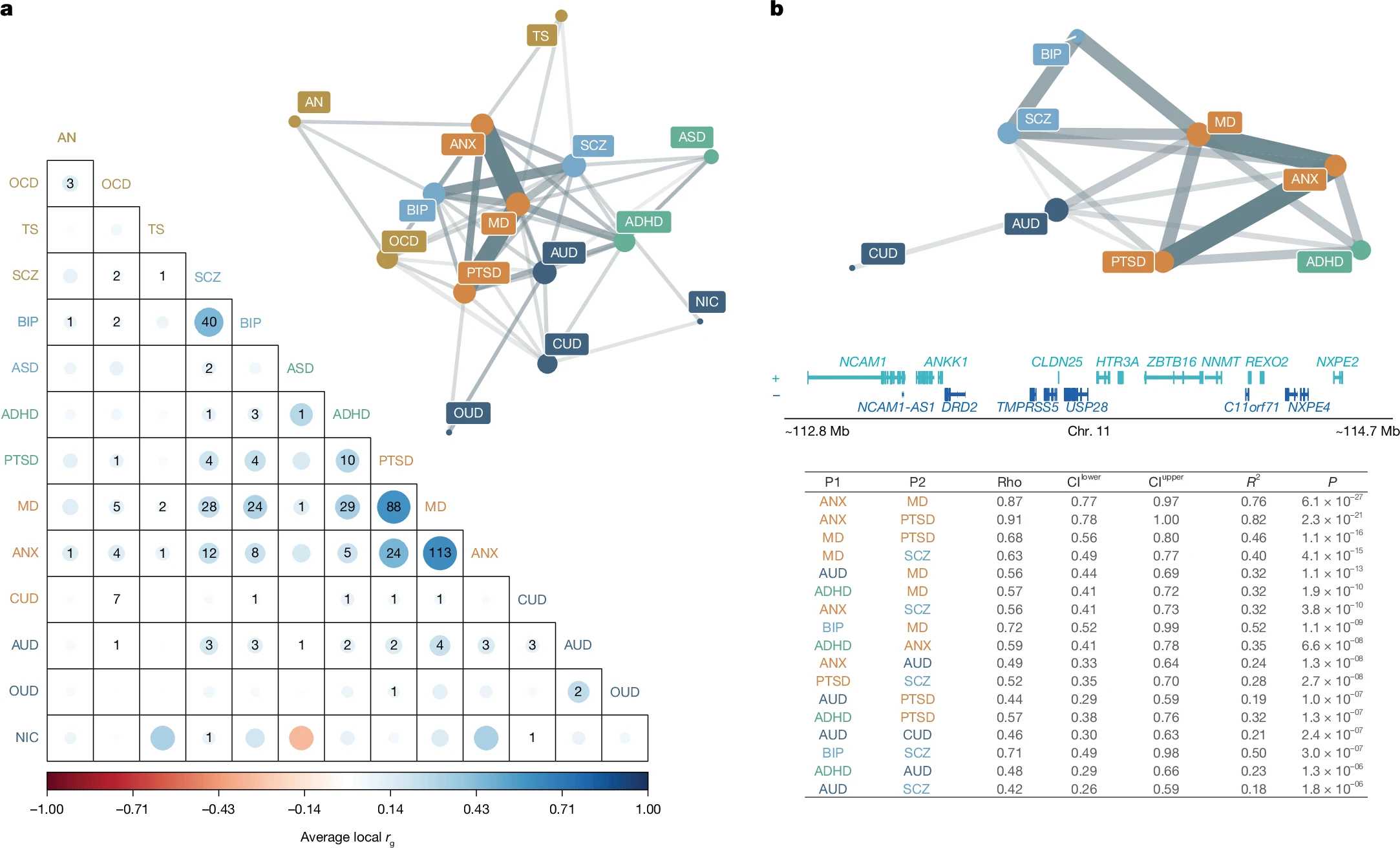 Правая часть рисунка фокусируется на наиболее важном из таких регионов – на 11-й хромосоме. В этом конкретном участке ДНК обнаружена значимая генетическая связь сразу для восьми различных расстройств. Сетевой график справа и таблица внизу детально показывают, между какими именно расстройствами и насколько сильна эта локальная связь. Здесь расположены несколько генов, которые связаны с работой мозга и поведением.