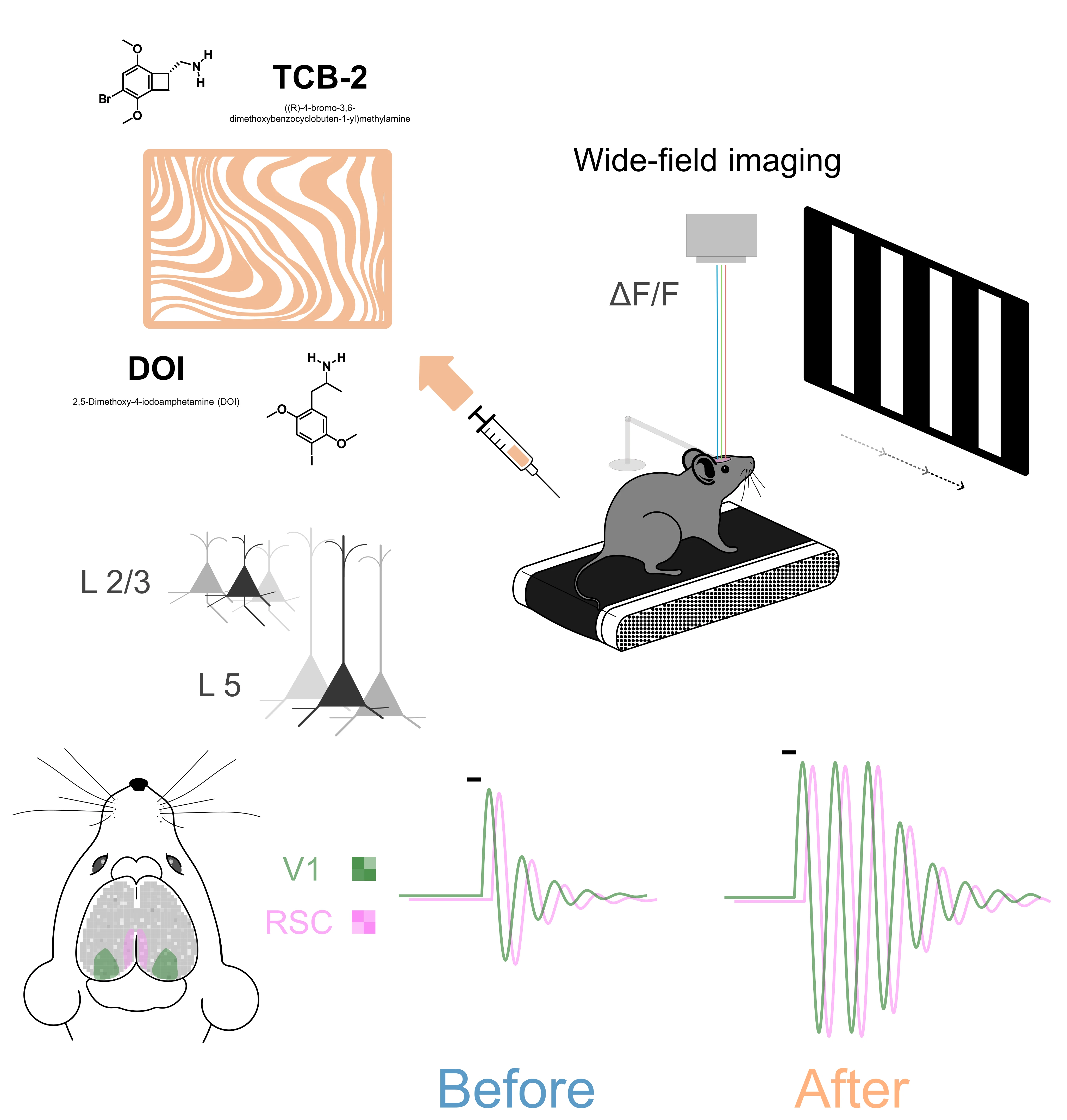 После введения психоделиков (DOI или TCB2) картина менялась: частота спонтанных колебаний возрастала, ритм 5 Гц стал возникать сам по себе гораздо чаще, чем в норме. Мозг начал генерировать внутреннюю активность без внешнего повода, а вызванные стимулом осцилляции становились мощнее и длительнее. Кроме того усиливалась синхронизация между зрительной и поясной (эта часть называется ретросплениальной) корой: до введения препарата мощность колебаний в этих зонах не коррелировала, а после между ними возникла четкая связь.