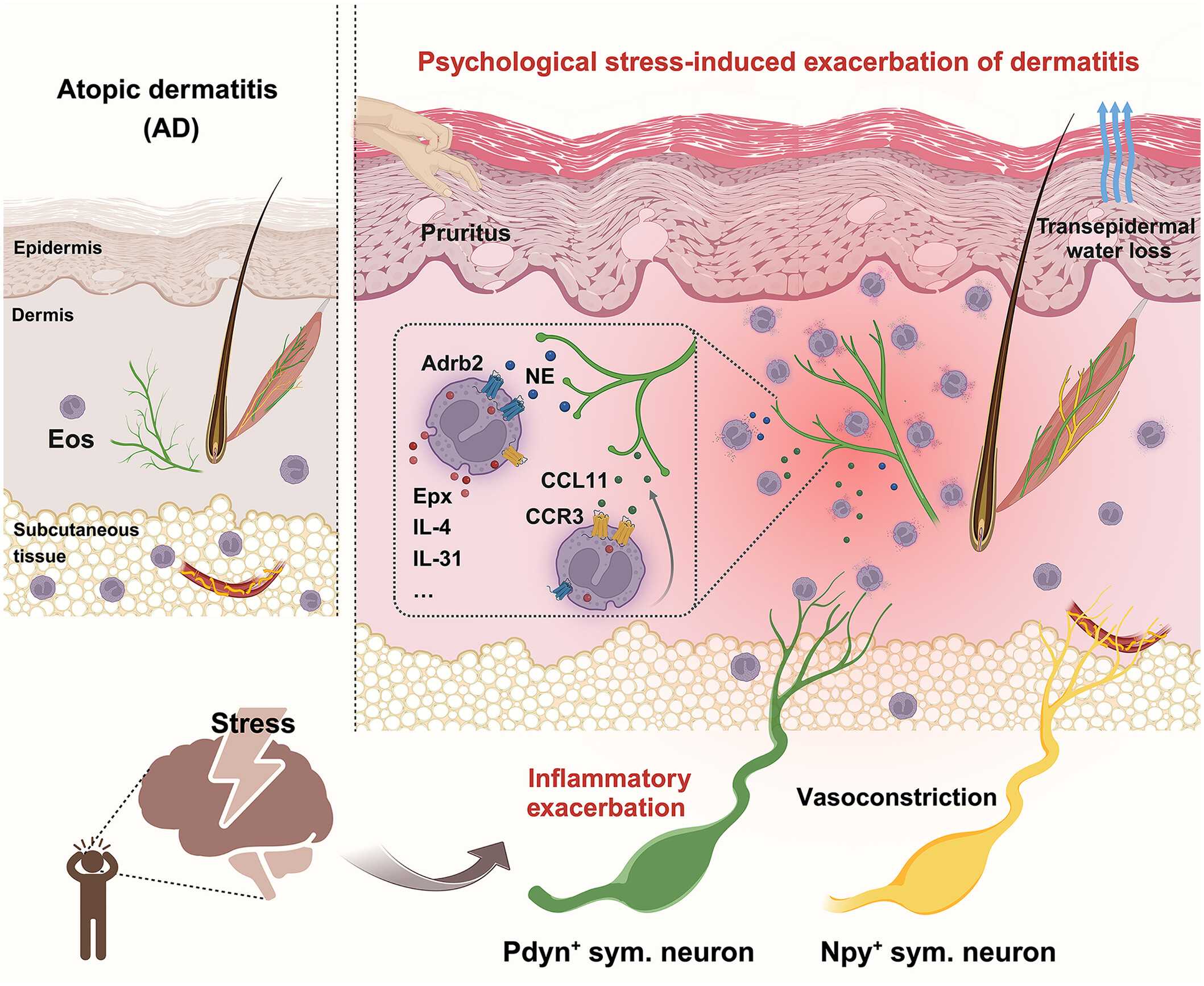 Эти выводы проверили на мышах с моделью дерматита, похожего на атипический. Все признаки воспаления усиливались: и расчесы, и утолщение дермы, и накопление эозинофилов в коже. Затем исследовали генетически модифицировали мышей, чтобы у них стало меньше эозинофилов или отсутствовала определенная подгруппа симпатических нервных клеток, известных как Pdyn+ нейроны, которые активируются при стрессе и напрямую связаны с кожей.