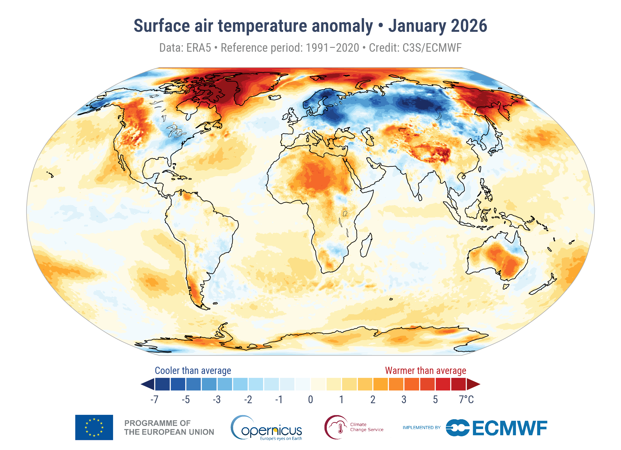 Для моря январь стал одним из четырех самых теплых за историю наблюдений — средняя температура морской поверхности составила 20,68 градуса. В Арктике протяженность морского льда была на шесть, а в Антарктике — на восемь процентов ниже средней за период 1991–2020 годов. Рекордные холода и снегопады в Фенноскандии, Балтийских странах, Восточной Европе, Сибири, а также в центральной и восточной частях США были вызваны извилистым движением полярного воздушного струйного течения, которое принесло арктический воздух в средние широты. При этом воздух на планете все равно оказался теплее, чем в среднем за последние 30 лет.